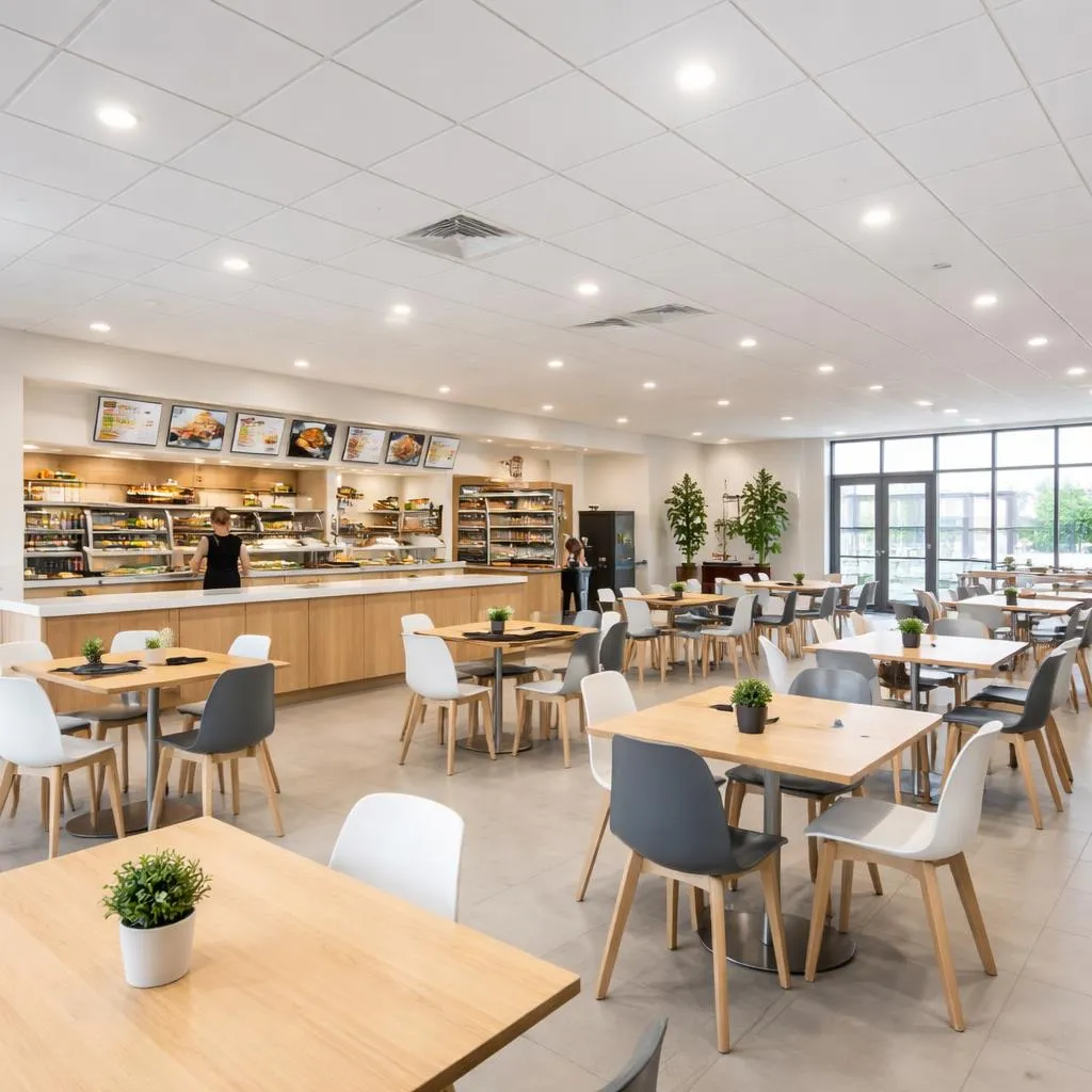Professional suspended ceiling installations for commercial kitchens and canteens. Our hygienic ceiling solutions feature fire-rated tiles, easy cleaning access, and moisture resistance. Perfect for reducing noise in bustling kitchen environments while maintaining hygiene standards.